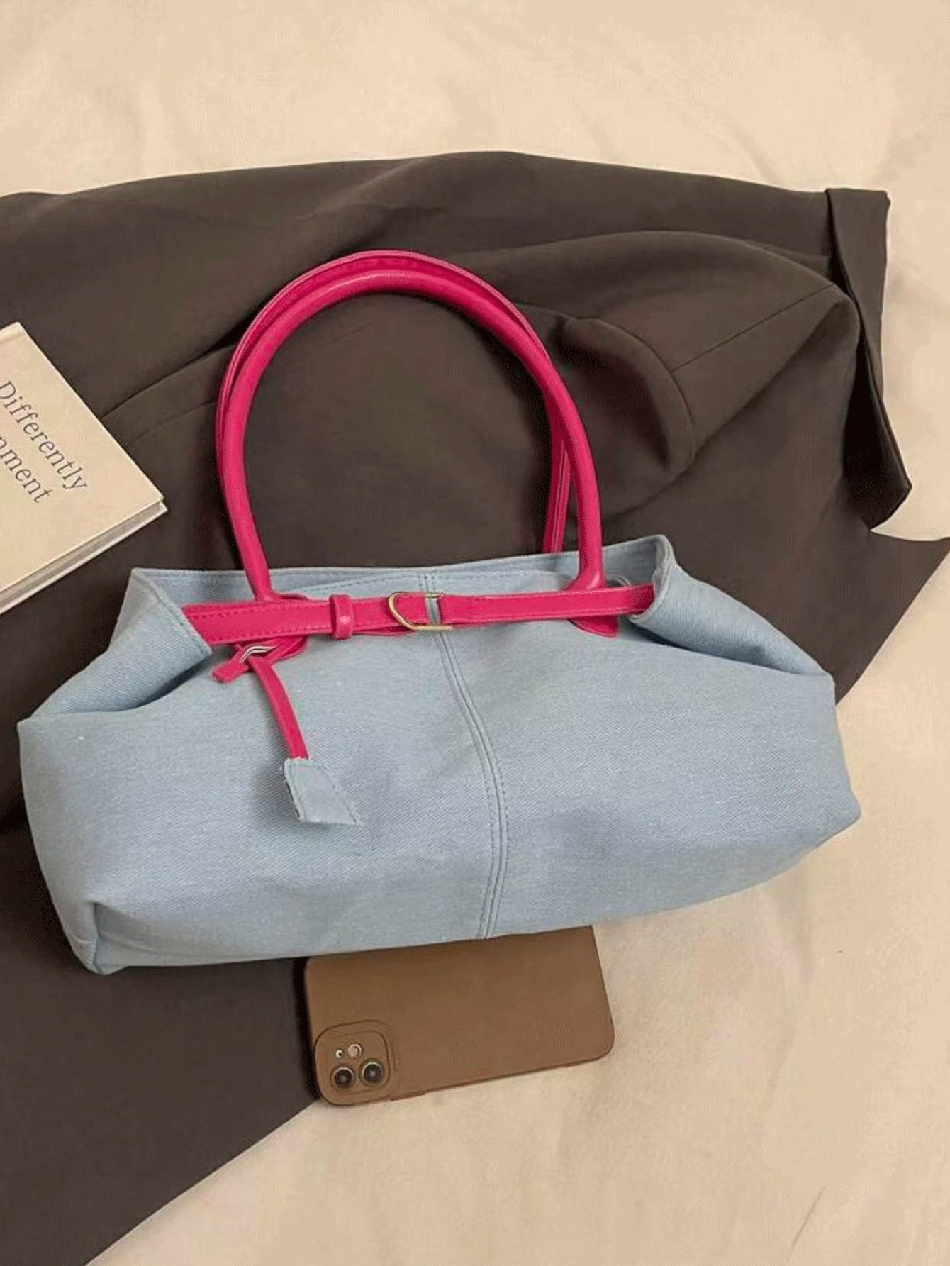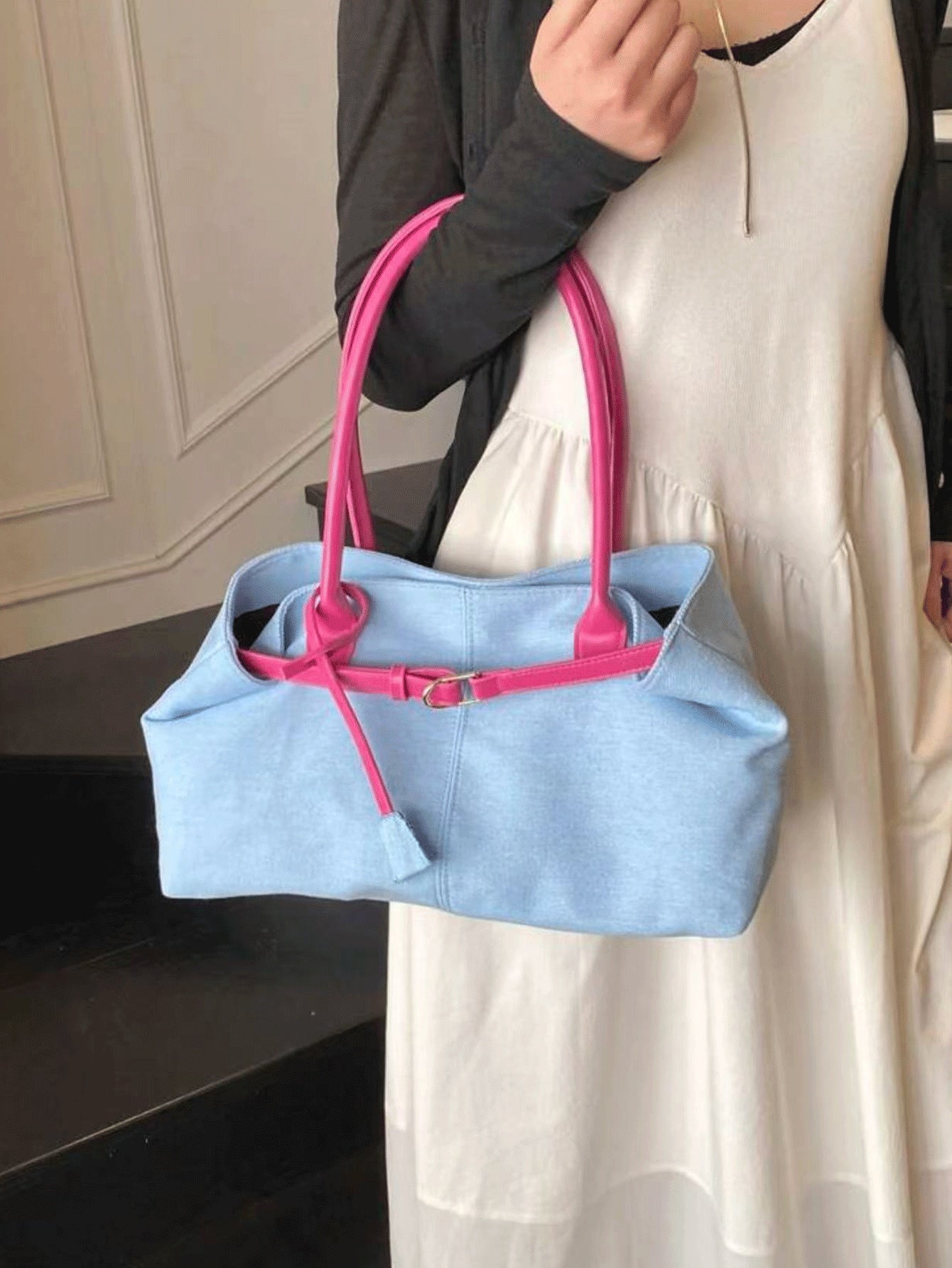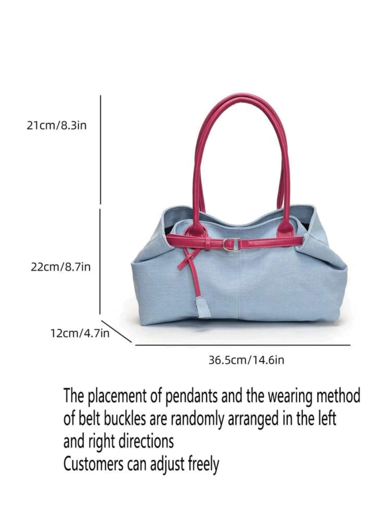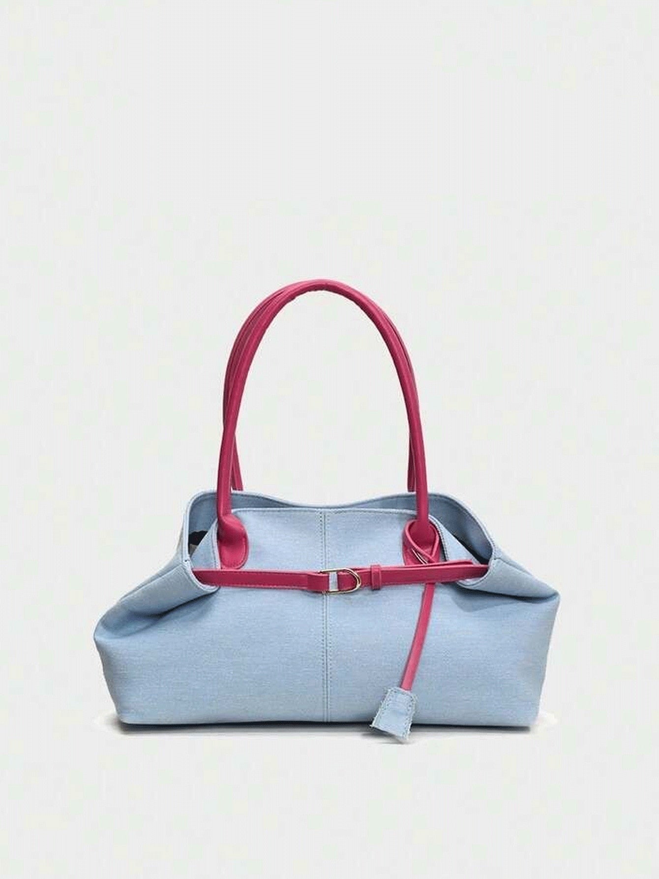 1pc Casual Light Blue & Magenta Tote Bag, Large Capacity, Personality Belt Decor, Simple Patchwork Chic Elegance, Ladies Shoulder Bag For Spring Office Commute Use (Accessory Position And Belt Buckle Wearing Method Random)