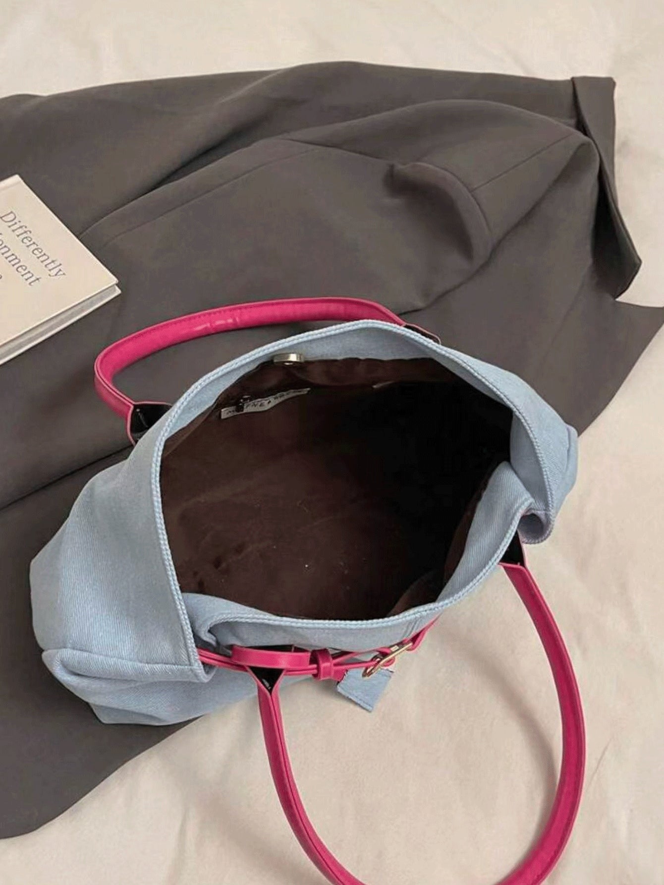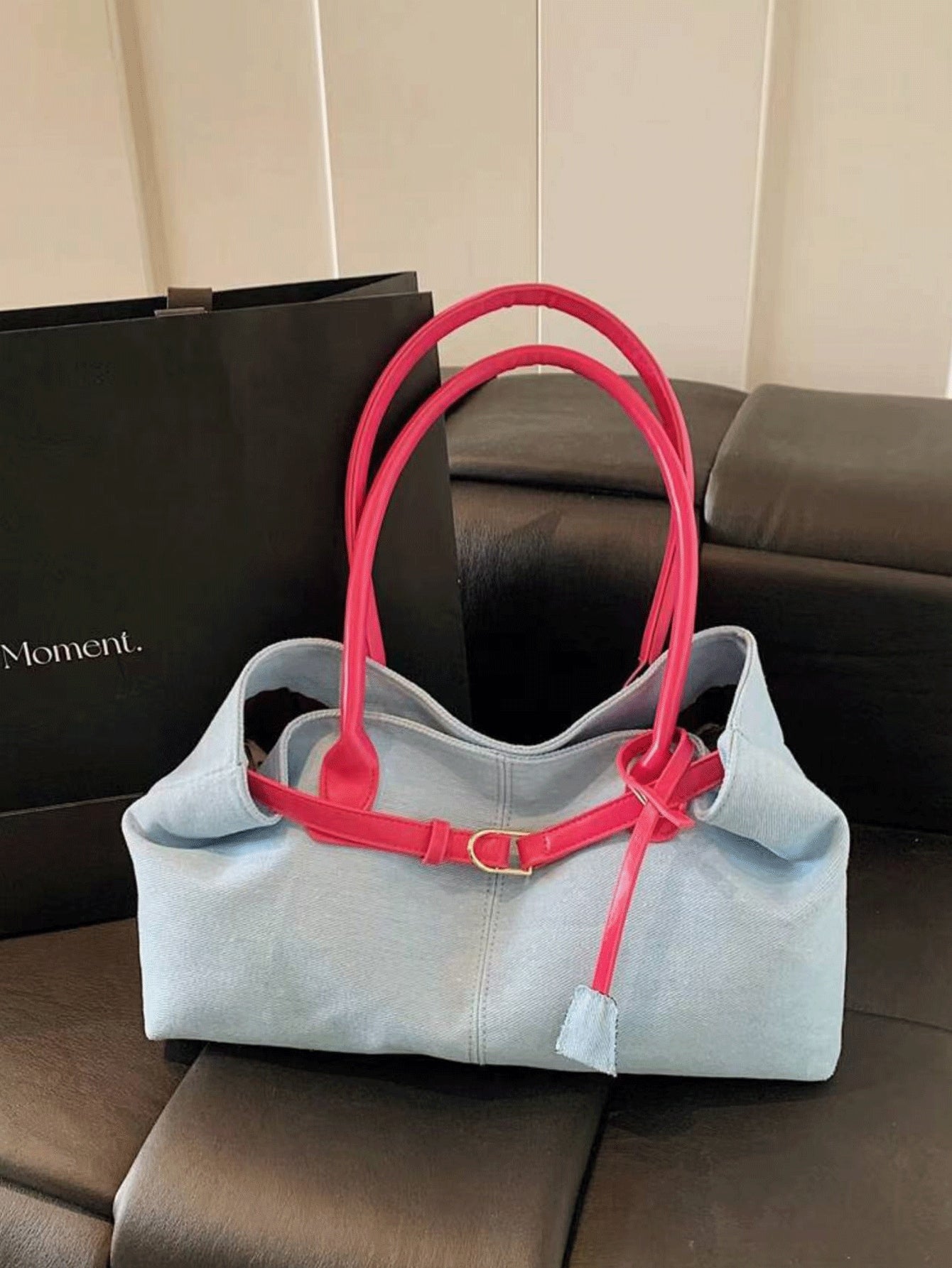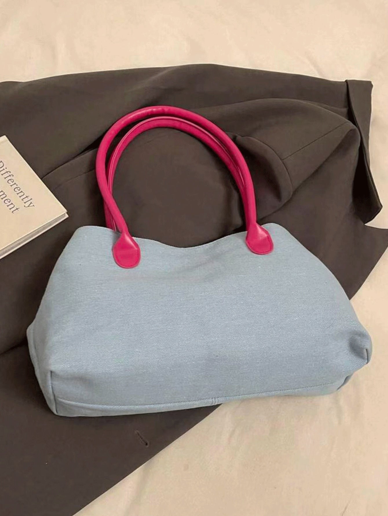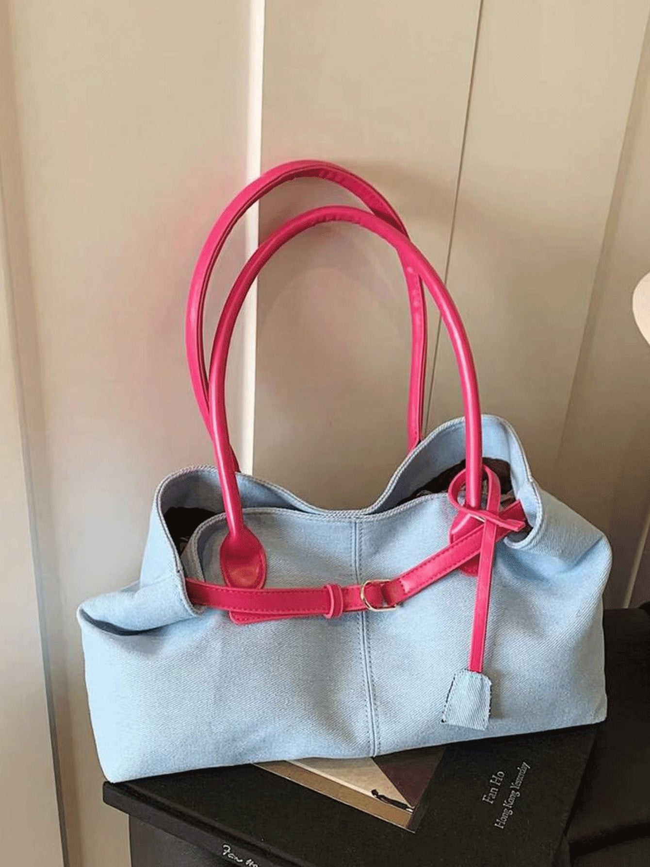 1pc Casual Light Blue & Magenta Tote Bag, Large Capacity, Personality Belt Decor, Simple Patchwork Chic Elegance, Ladies Shoulder Bag For Spring Office Commute Use (Accessory Position And Belt Buckle Wearing Method Random)